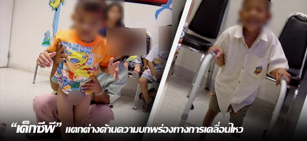 เด็กซีพี อายุ 7 ปี (ซ้าย) ไม่สามารถยืนเดินได้ เวลายืนขาจะหนีบไขว้ เท้าเขย่งบิด ต้องมีคนคอยจับไว้ (ขวา) 3 เดือน ภายหลังการเข้ารับโปรแกรมการฟื้นฟู เด็กสามารถเดิ นได้โดยใช้เครื่องช่วยเดิน