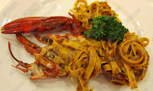 เครื่องปรุง : พริกหวาน (สีแดง) เอาเม็ดออกและหั่นละเอียด 200 กรัม/มะเขือเทศสับละเอียด 200 กรัม/หอมใหญ่สับละเอียด 100 กรัม/กระเทียมสับ 20 กรัม/น้ำมันมะกอกบริสุทธิ์ 200 มล./เกลือพริกไทย/กุ้งล็อบสเตอร์/ออริกาโน่แห้ง 30 กรัม/ไวท์ไวน์ 100 มล./เส้นพาสต้า (Chilli Fettuccine)