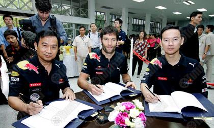สองผู้บริหารใหญ่ค่ายกระทิงแดง เฉลิม และ สราวุฒิ อยู่วิทยา พร้อมด้วยสุดยอดนักแข่งรถฟอร์มูลาวัน "มาร์ค เว็บเบอร์" ร่วมลงนามถวายพระพรในหลวง ที่ รพ.ศิริราช