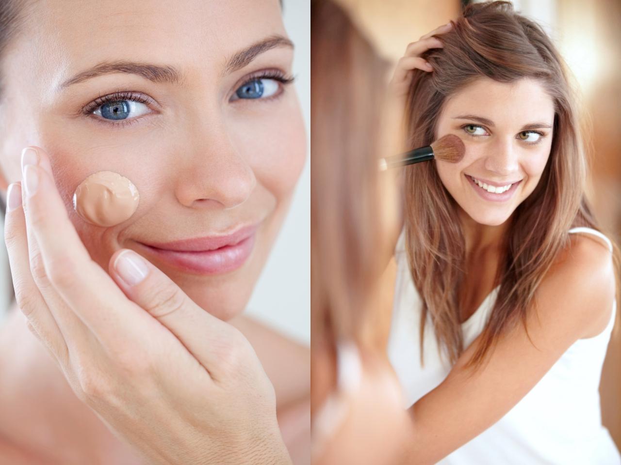 ควรเลือกรองพื้นสูตรน้ำ เนื้อบางเบา แต่ปกปิดได้ดี (ไม่ควรใช้รองพื้นเนื้อครีม) เกลี่ยลงให้ทั่วใบหน้า หลีกเลี่ยงการใช้ฟองน้ำหรือแปรงในการลงรองพื้น พอเราเอามาใช้ซ้ำๆ แล้วยิ่งจะทำให้สิวขึ้นง่าย ให้ใช้นิ้วมือนี่แหละเกลี่ยเบาๆ แตะๆ ให้รองพื้นเนียนไปกับผิว (ถ้าปกปิกไม่ดีพอ ให้ใช้คอนซีลเลอร์ลงเพิ่มได้ แต่ต้องเป็นสูตร non-comedogenic เช่นกัน