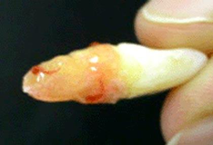 4. ตรวจสอบว่ารากฟันหักหรือไม่ ถ้ารากฟันไม่หักให้รีบใส่ฟันกลับเข้าที่ให้ถูกต้อง (ถ้าสามารถทำได้) แล้วรีบพาเด็กไปพบทันตแพทย์ทันที