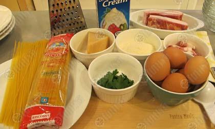 ส่วนผสม : เส้นสปาเก็ตตี้/วิปครีม 150 ml/ ไข่แดง 2 ฟอง/เบคอน หรือแฮม 80 กรัม/พาร์เม-ซานชีส 40 กรัม หรือจะใช้ pecorino cheese แทนก็ได้/เกลือ และ พริกไทย