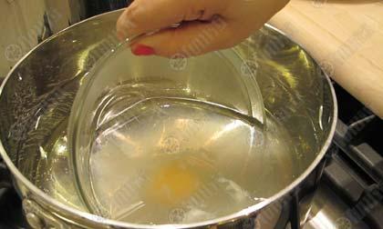 วิธีทำ POACHED EGG : ใช้น้ำประมาณ 1 1/2 ลิตร ตั้งไฟปานกลาง เติมน้ำส้มสายชู (white vinegar) 1/2 ถ้วย และเกลือ 1 ชต. ลงผสม คนให้เกลือ ละลายและน้ำส้มเข้ากับน้ำ เพื่อว่าเมื่อเทไข่ลงไปจะได้เซ็ตตัวเป็นก้อน พอน้ำเริ่มอุ่นขึ้น โดยมีฟองอากาศปุดๆขึ้นที่ก้นหม้อ จึงหย่อนถ้วยที่ตอกไข่ใส่ไว้ลงไปในน้ำ แล้วค่อยเทไข่ออกจากถ้วย จากนั้นใช้ทัพพีคอยตะล่อมไข่ขาวให้คลุมไข่แดงเอาไว้ และหรี่ไฟลง ต้มไปประมาณ 5 นาที ดูให้ไข่ขาวสุก ส่วน ไข่แดงยังเป็นน้ำๆอยู่ ใช้ทัพพีมีรู (slotted spoon) ช้อนไข่ขึ้นพักไว้ ส่วนไข่ขาวที่ลอยอยู่ผิวน้ำให้ตักออก