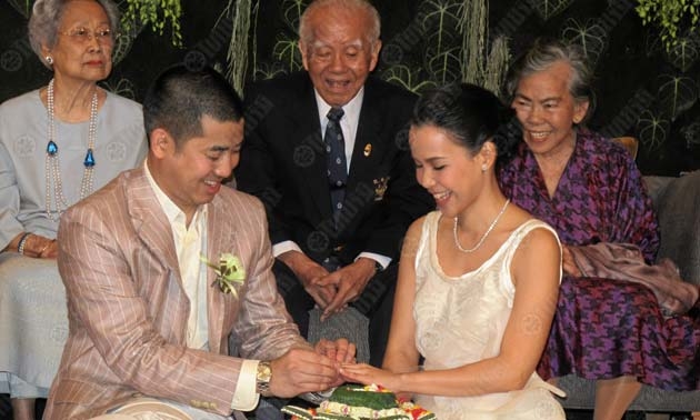 จากนั้นได้เข้าสู่พิธีหมั้น โดยฝ่ายเจ้าบ่าวมี คุณตาดุษฏี และ คุณยายทอสี สวัสดิชูโต เป็นผู้ใหญ่สู่ขอเจ้าสาวจาก คุณยายแสงเดือน วรรณรัตน์ ของเจ้าสาว จนกระทั่งเวลา 10.19 น. จึงได้ฤกษ์สวมแหวนหมั้นและจดทะเบียนสมรส ก่อนตามด้วยพิธีรดน้ำสังข์ ซึ่งมี ม.จ.ภีศเดช รัชนี เป็นประธาน ส่วนพิธีฉลองสมรส บ่าวสาวขอเว้นวรรค เพราะปีนี้เป็นปีชงของเจ้าบ่าวที่เกิดปีระกา จึงเว้นช่วงไปจัดในวันที่ 9 ก.ค. ที่โรงแรมแมนดาริน โอเรียนเต็ล อีกเช่นกัน.