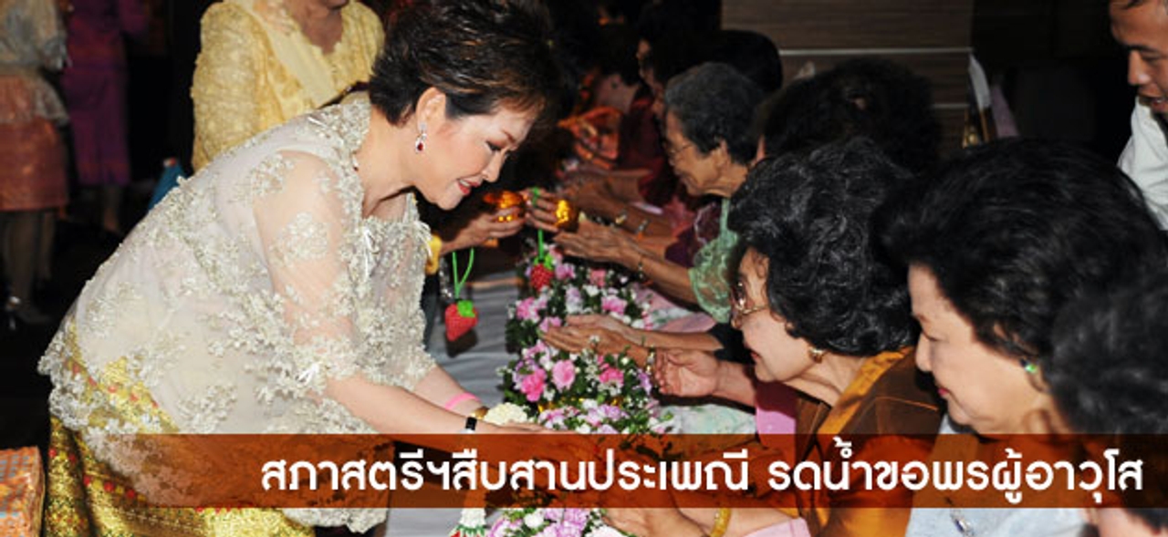 ร่วมสืบสานประเพณีสงกรานต์อันดีงามของไทยในการ “รดน้ำขอพรผู้อาวุโส” เป็นประจำทุกปี ในปีนี้ สภาสตรีแห่งชาติ ในพระบรมราชินูปถัมภ์ ได้ฤกษ์ดีวันที่ 19 เม.ย.ที่ผ่านมา จัดงาน “รดน้ำขอพรผู้อาวุโส ประจำปี 2554” ที่โรงแรมเอทัส ซอยร่วมฤดี ซึ่งมีผู้อาวุโสมาร่วมงานกันคับคั่ง อาทิ อดีตประธานสภาสตรีแห่งชาติฯ ศ.กิตติคุณ คุณดวงเดือน พิศาลบุตร, จรรย์สมร วัธนเวคิน, พันเอกหญิง คุณหญิง อัสนีย์ เสาวภาพ, เรือนแก้ว กุยยกานนท์ แบรนด์ท นอกจากนี้ ยังมีผู้ใหญ่ที่เคยร่วมงานกับสภาสตรีฯ อาทิ คุณหญิงจวบ จิรโรจน์, คุณหญิงโรส บริบาลบุรีภัณฑ์, อนุรัชนี ศิริสัมพันธ์ ฯลฯ