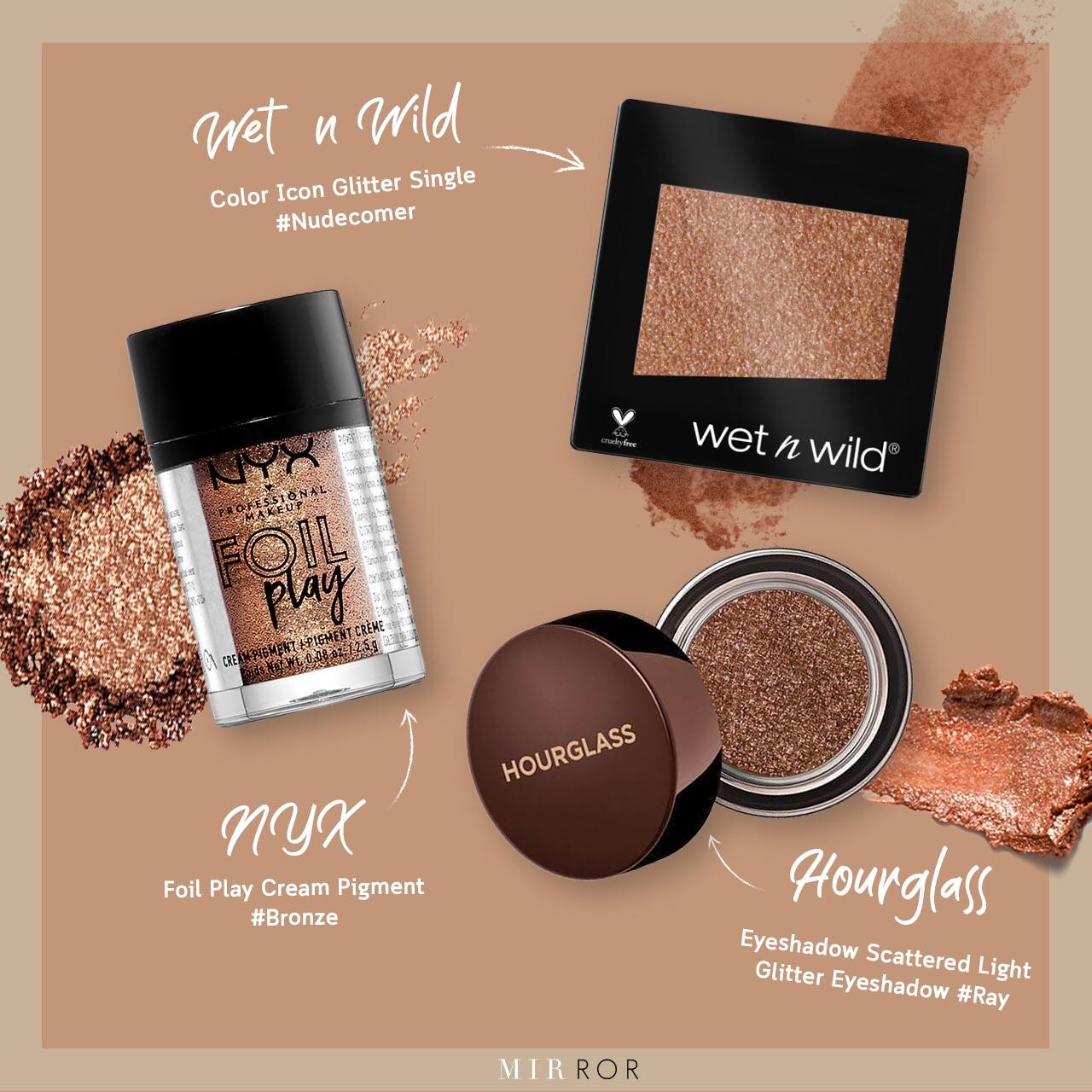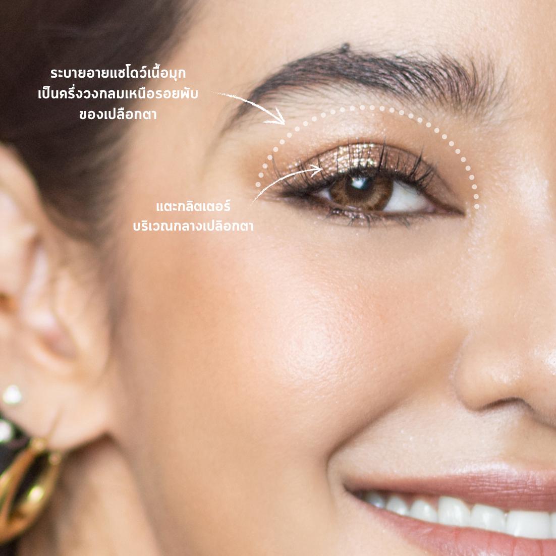 - ปิดท้ายด้วยอายแชโดว์กลิตเตอร์เนื้อครีมสีน้ำตาล โดยทาเน้นบริเวณขอบขนตาและเกลี่ยไปจนถึงรอยพับของเปลือกตา ลองใช้กระดาษทิชชูรองบริเวณใต้ดวงตา เพื่อกันเศษกลิตเตอร์ตกลงมาเลอะ