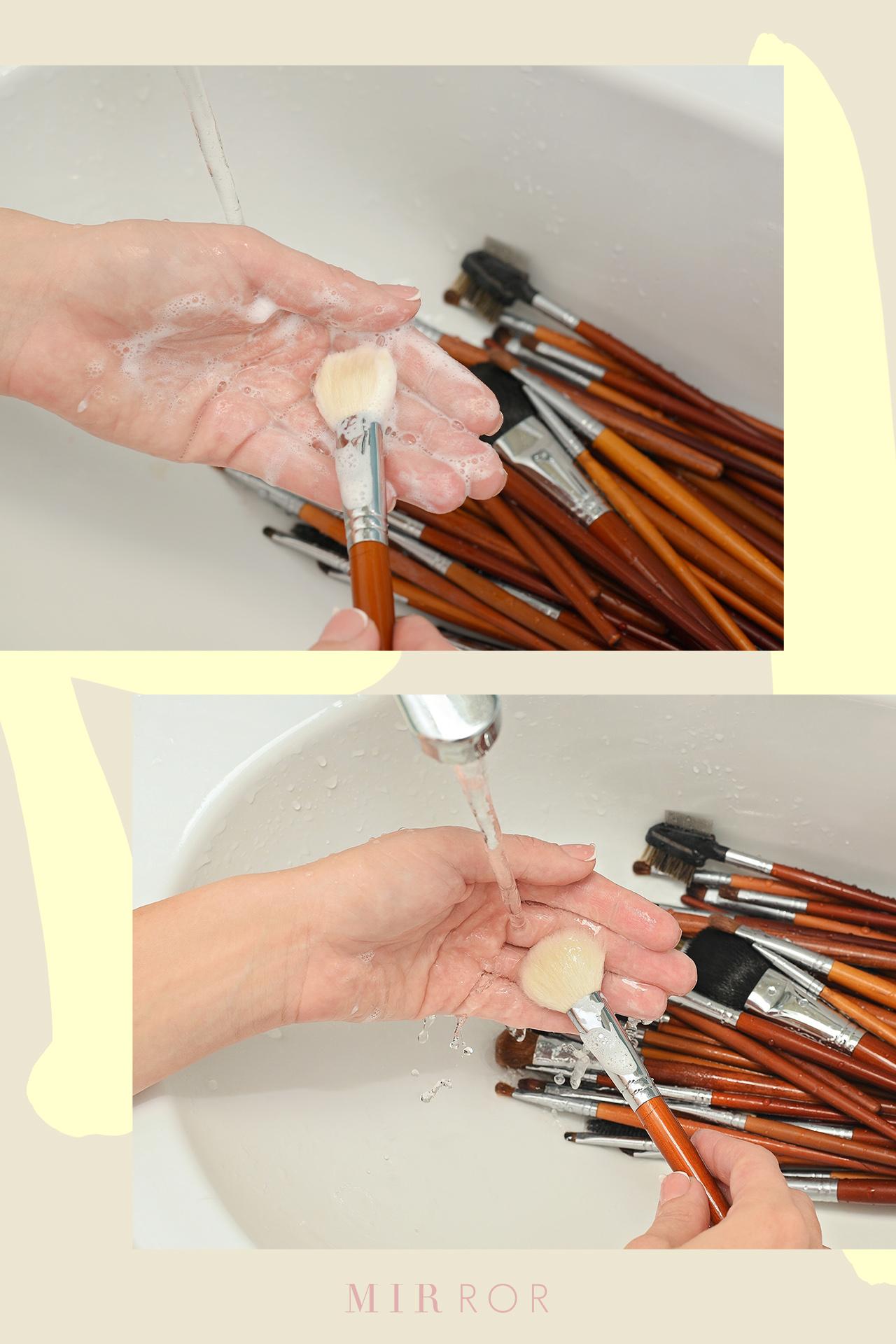 -ล้างน้ำสะอาดจนไม่เหลือฟองอยู่ที่แปรงหรือฟองน้ำแต่งหน้า