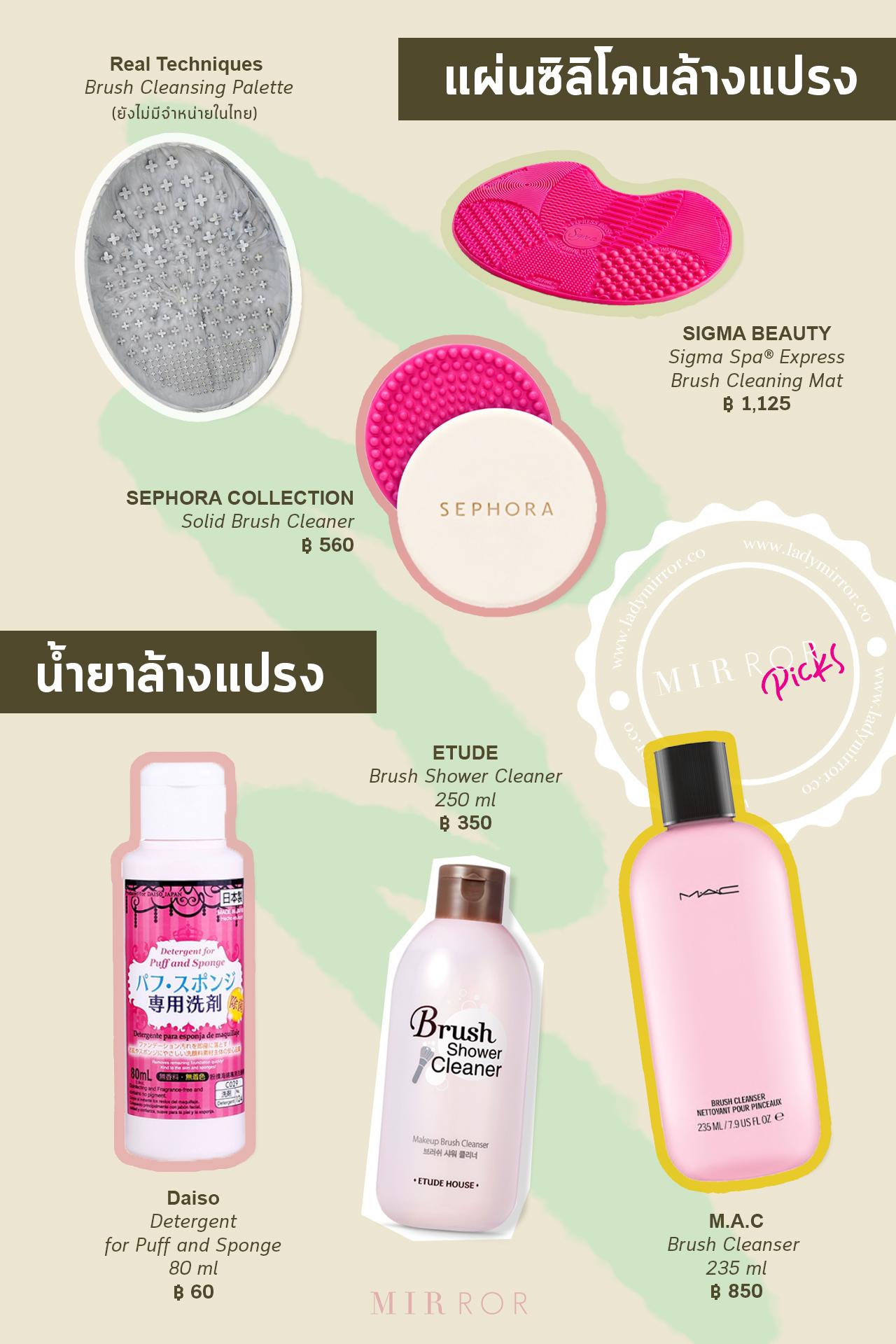 Lady MIRROR มีหลากหลายตัวเลือกในการใช้ทำความสะอาดอุปกรณ์แต่งหน้า ทั้งน้ำยาและอุปกรณ์ที่ใช้