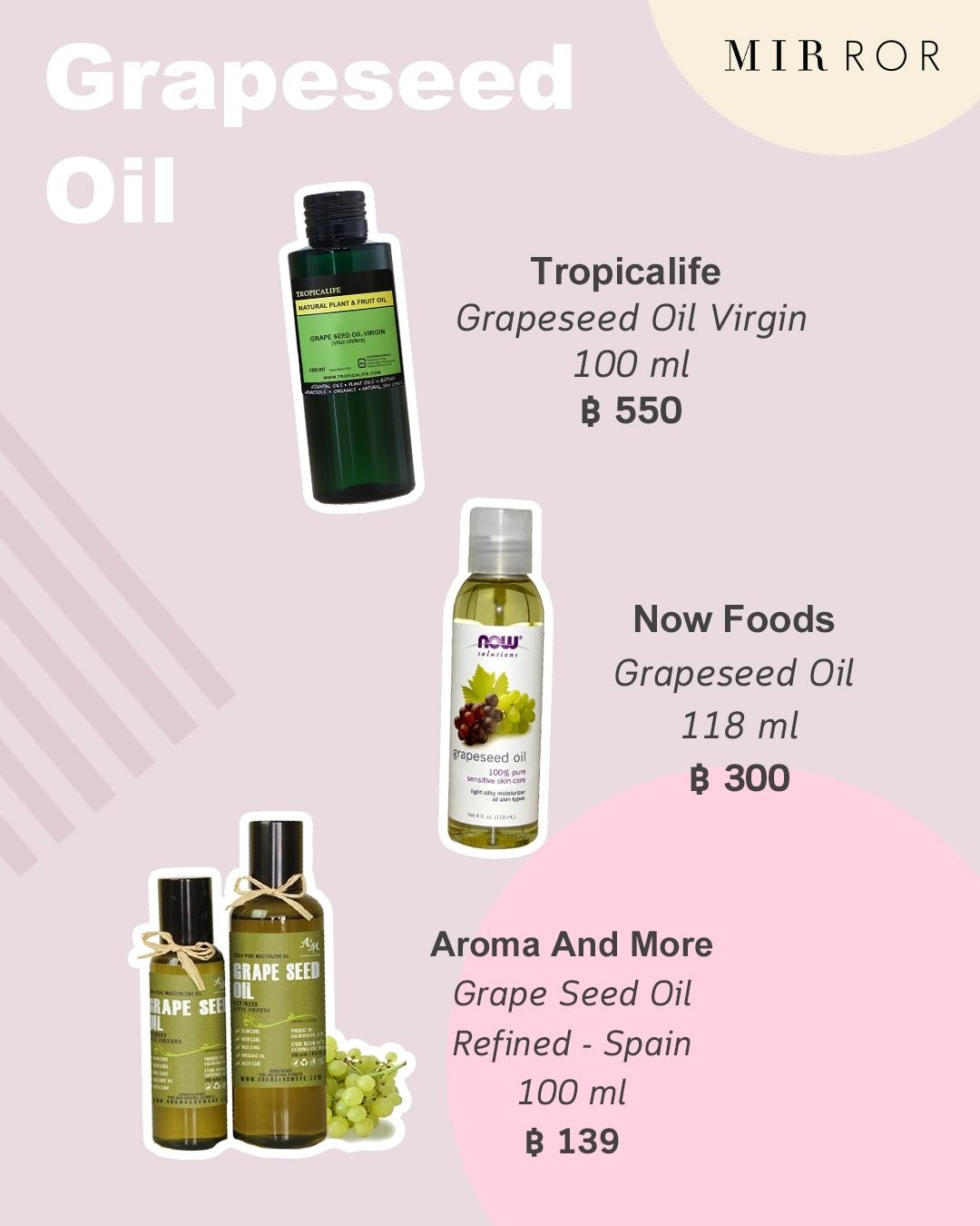 -น้ำมันเมล็ดองุ่น (Grapeseed oil) เต็มไปด้วยกรดไขมัน และสารต่อต้านอนุมูลอิสระ เช่น กรดไลโนเลอิก (กรดไขมันโอเมก้า-6) ที่ช่วยบำรุงขนตาให้มีสุขภาพดี กระตุ้นการเจริญเติบโต ลดการหลุดร่วง เพิ่มความเงางามให้กับขนตา แถมยังเป็นน้ำมันที่บางเบาจึงไม่ทำให้รู้สึกหนักขนตา