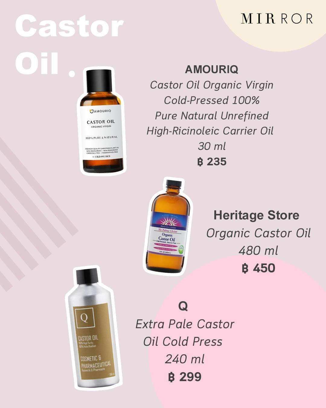 -"น้ำมันละหุ่ง" อุดมไปด้วยกรดริซิโนเลอิก หรือกรดไขมันโอเมก้าที่ช่วยบำรุงขนตา เส้นผม และขนคิ้วให้มีสุขภาพดีและช่วยเร่งการเจริญเติบโตได้อีกด้วย นอกจากนั้นนำ้มันละหุ่งยังอุดมไปด้วยวิตามิน E ที่สามารถช่วยซ่อมแซมความเสียหายของรากขนและรูขุมขน ทั้งยังช่วยเพิ่มความชุ่มชื้นและทำให้ขนตามีสุขภาพที่แข็งแรงขึ้นอีกด้วย