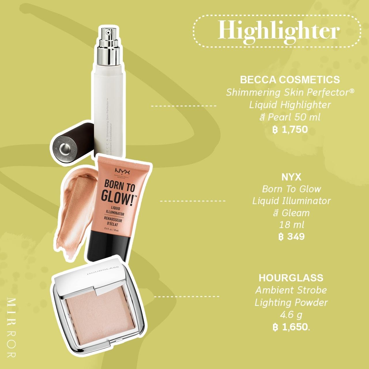 "Highlighter" แบบครีมหรือแบบลิควิดคือเคล็ดลับสำคัญของผิวที่ดูโกลว์เปล่งปลั่งจากภายในสู่ภายนอก ทั้งยังช่วยให้ผิวหน้าดูกระจ่างใสขึ้นอีกด้วย MIRROR แนะนำให้แตะเนื้อผลิตภัณฑ์เพียงเล็กน้อยบริเวณใต้คิ้วตรงส่วนที่โก่ง โหนกแก้ม สันจมูกช่วงบริเวณระหว่างตาทั้งสองข้างและปลายจมูก ไม่ควรลากเป็นเส้นตรงลงมาทั้งสันจมูกเพราะจะดูเป็นแท่ง ไม่สวยเป็นธรรมชาติ และถ้า Lady MIRROR คนไหนอยากให้หน้าพุ่งทะลุไปสู่จักรวาล สามารถใช้ Highlighter แบบพาวเดอร์ลงทับไปบนเนื้อลิควิดได้อีกชั้นหนึ่ง MIRROR ฝากไว้นิดนึงว่าสาวๆ ไม่ควรใช้ Highlighter ในบริเวณที่รูขุมขนกว้าง เพราะผิวสัมผัสที่สะท้อนแสงจะยิ่งทำให้รูขุมขนของคุณเด่นชัดมากขึ้น (How to: แก้ปัญหา "รูขุมขนกว้าง" ง่ายๆ แต่ได้ผล!)