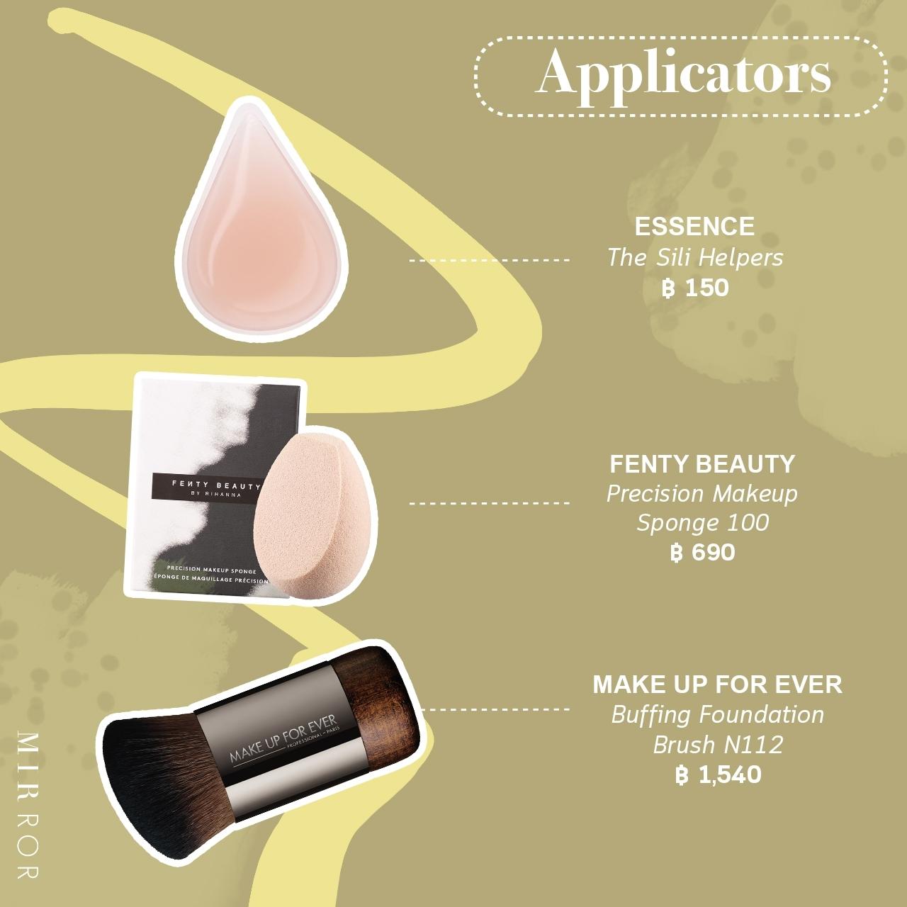 ฟองน้ำ: ที่ฮิตๆ กันน่าจะหนีไม่พ้นฟองน้ำรูปไข่ที่เดี๋ยวนี้มีให้เลือกหลายรูปทรงเพื่อให้เข้าถึงซอกหลืบต่างๆ ได้ดียิ่งขึ้น แต่ข้อเสียคือเจ้าฟองน้ำที่ว่าเนี่ยเป็นตัวทำให้เราใช้รองพื้นเปลืองเกินจำเป็น เพราะน้องเค้าจะดูดเนื้อรองพื้นเข้าไป วิธีแก้คือให้นำฟองน้ำไปจุ่มน้ำ บีบให้หมาดๆ เพื่อลดการดูดซับรองพื้นเมื่อนำมาใช้ และจากปัญหานี้เลยมี Applicator อีกชนิดที่ถูกออกแบบมาเพื่อแก้จุดอ่อนนี้โดยเฉพาะ ด้วยการใช้วัสดุที่เป็นซิลิโคนที่ไม่ดูดเนื้อรองพื้นเข้าไปเลย