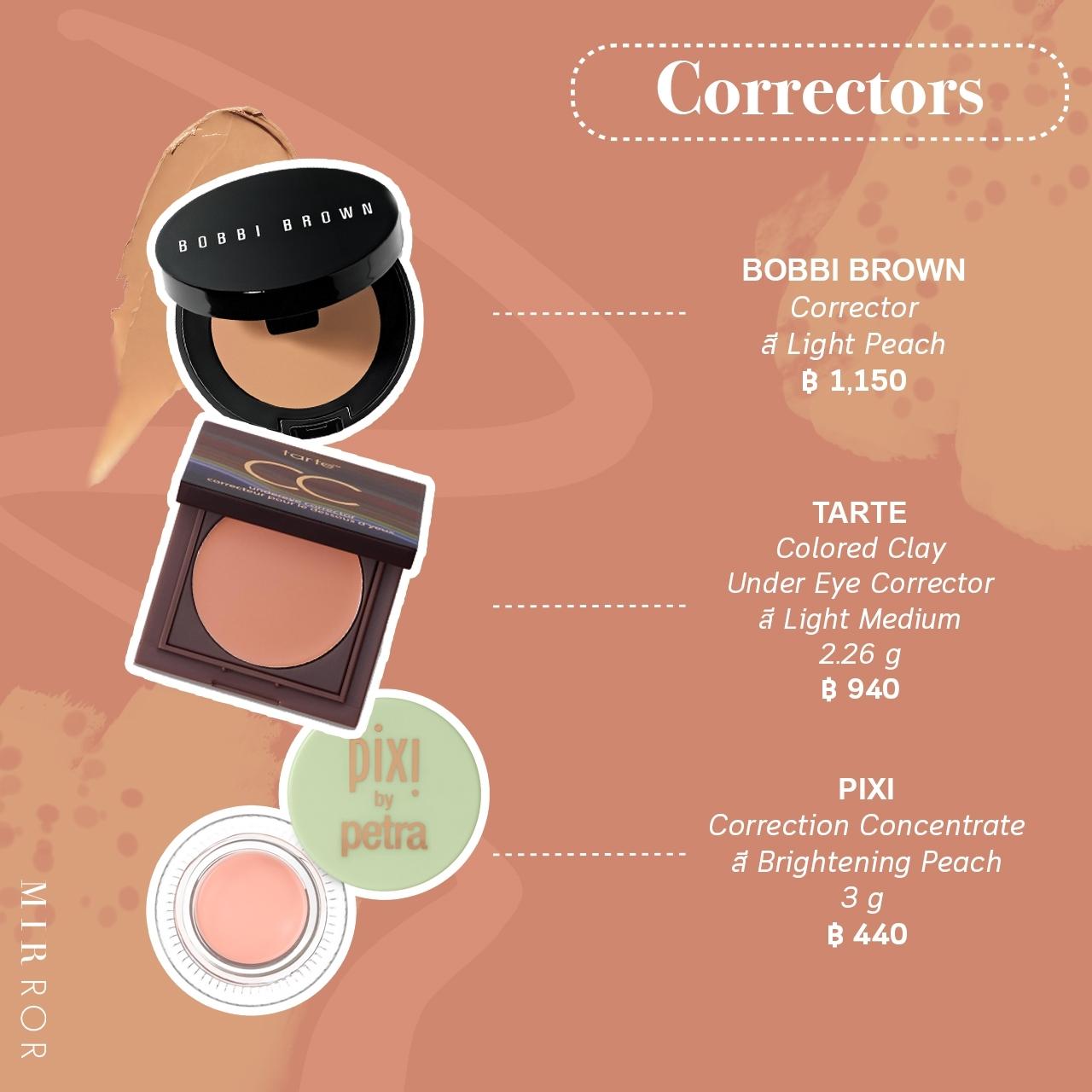ถ้าลองสังเกตดีๆ รอยคล้ำใต้ตาของสาวๆ หลายคนมี Undertone ของสีออกไปทางสีน้ำเงินหรือสีม่วงเนื่องจากเส้นเลือดฝอยที่หล่อเลี้ยงอยู่ใต้ผิวหนัง ดังนั้นในการปรับให้สีผิวใต้ตาที่คล้ำให้ดูสว่างและเป็นกลางขึ้นจึงควรใช้ Corrector ที่มีโทนสีส้มหรือสีพีชในการเบรกสี โดยแตะเนื้อผลิตภัณฑ์เพียงเล็กน้อยบริเวณหัวตา หรือส่วนที่มีรอยคล้ำ ไม่ควรลง Corrector เป็นปื้นหรือเป็นรูปสามเหลี่ยมหัวกลับแบบที่ Blogger หลายๆ คนชอบทำเพราะมันดูไม่ธรรมชาติ ยกเว้นว่า Lady MIRROR อยากแต่งหน้าเลียนแบบลุคของ Drag Queen อันนั้นเราก็ไม่ว่ากัน (7 เคล็ดลับ "คอนซีลเลอร์" ที่คุณยังไม่รู้)