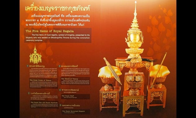 “อาจารย์เผ่าทอง” ยังเล่าถึงความสำคัญของ เครื่องเบญจราชกกุธภัณฑ์ ว่า เป็นเครื่องแสดงความเป็นพระราชา 5 สิ่ง ที่นำขึ้นทูลเกล้าฯถวายพระเจ้าแผ่นดิน เมื่อเสด็จประทับพระที่นั่งภัทรบิฐในพระราชพิธีบรมราชาภิเษก ประกอบด้วย พระมหาพิชัยมงกุฎ หรือมงกุฎที่ใช้ในการทำพระราชพิธีราชาภิเษกพระเจ้าแผ่นดิน จัดทำขึ้นตามพระราชดำริในพระบาทสมเด็จพระจอมเกล้าเจ้าอยู่หัว, พระแสงขรรค์ชัยศรี เป็นดาบคู่แผ่นดินของพระมหากษัตริย์ไทย โดยในรัชสมัยของรัชกาลที่ 1 โปรดให้ทำด้ามและฝักดาบขึ้นใหม่, ธารพระกรชัยพฤกษ์ ไม้เท้าทำด้วยไม้ชัยพฤกษ์หุ้มทอง, วาลวีชนีและพระแส้จามรี รัชกาลที่ 4 โปรดให้เชิญพระแส้หางช้างเผือกเข้าพิธีร่วมกับพระแส้จามรี และฉลองพระบาทเชิงงอน ทำด้วยทองคำลงยา สร้างสรรค์ขึ้นในสมัยรัชกาลที่ 1