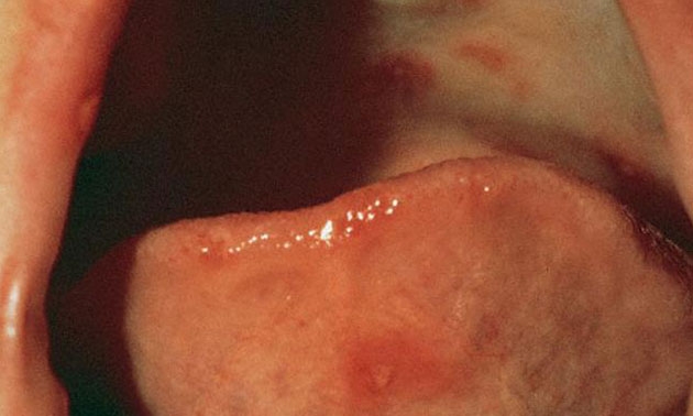 หลังจากได้รับเชื้อ3-6วัน ผู้ติดเชื้อจะเริ่มแสดงอาการป่วย เริ่มด้วยมีไข้ต่ำๆ อ่อนเพลีย ต่อมาอีก1-2 วัน มีตุ่มแดงขนาด 2-8 มิลลิเมตรที่ลิ้น เหงือก และกระพุ้งแก้ม ต่อมาก็จะเห็นเป็นตุ่มน้ำสีเทาเล็กๆ เพราะตุ่มน้ำจะแตกเร็ว เห็นเป็นแผลตื้นๆ สีออกเหลืองเทา และมีผื่นแดงล้อมรอบแผลเล็กๆ อาจรวมเป็นแผลขนาดใหญ่ แผลเหล่านี้มักเจ็บ และทำให้เด็กไม่ยอมรับประทานอาหาร อีกทั้งยังทำให้ลิ้นมีสีแดงและบวมได้ แต่รอยโรคเหล่านี้มักจะหายไปใน 5-10 วัน
