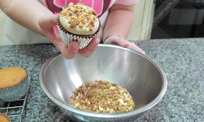 วิธีทำวานิลลาคัพเค้ก : 1) ตั้งเตาอบที่อุณหภูมิ 180 ํC จากนั้นเรียงกระทงฟอยล์ลงในถาดมัฟฟินเตรียมไว้ 2) ใช้หัวตีรูปใบไม้ตีเนยสดกับน้ำตาลทรายขาวด้วยความเร็วต่ำนาน 1 นาที จึงเพิ่มความเร็วสูง แล้วตีต่ออีก 5 นาทีจนเข้ากัน ปิดเครื่อง 3) ร่อนแป้งฟูเอง แล้วแบ่งเป็น 2 ส่วน 4) ใช้ส้อมตีไข่และวานิลลาเพียงเบาๆ ให้เข้ากัน แล้วแบ่งเป็น 3 ส่วน ใส่ส่วนแรกลงในส่วนผสมเนย ตีพอเข้ากัน 5) เปิดเครื่องตีใช้ความเร็วต่ำ พร้อมเปลี่ยนหัวตีเป็นรูปตะกร้อ ใส่แป้งฟูเองที่ร่อนไว้ลงตีสลับกับส่วนผสมไข่ที่เหลือทีละส่วนจนหมด และเข้ากันดี จึงเพิ่มความเร็วสูงตีต่ออีก 5 นาที 6) ใช้ที่ตักไอศกรีมขนาดเส้นผ่าศูนย์กลาง 2 นิ้ว ตักส่วนผสมใส่กระทงฟอยล์ละ 1 ลูก แล้วนำเข้าอบนาน 22 นาที หรือจนสุกดี ยกออกจากเตาพักไว้บนตะแกรงให้เย็น 7) บีบวานิลลาบัตเตอร์ครีมฟรอสติ้งบนหน้าเค้ก แล้วโรยน้ำตาลเม็ดสีให้ดูสวยงาม ก็จะได้คัพเค้กเป็นสีสันในงานเลี้ยงทุกโอกาส.