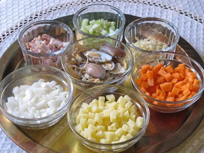 ส่วนผสมซุปหอยลาย : หอยลาย 1 กก./เนย 1 ชต./นมสด 1 ถ้วย/หอมหัวใหญ่หั่นลูกเต๋าเล็กๆ 1/2 ถ้วย/แครอทลวกนิ่มหั่นลูกเต๋าเล็กๆ 1/2 ถ้วย/มันฝรั่งหั่นลูกเต๋าเล็กๆ 1/2 ถ้วย / เซเลอรีซอยเล็กน้อย / กระเทียมสับ 1 ชต./น้ำซุป กระดูกไก่ 2 ถ้วย /น้ำต้มหอยลาย 1 ถ้วย / เกลือ 1/2 ชช./ พริกไทยดำ และผักชีฝรั่งอย่างละเล็กน้อย/ใบเบซิลแห้ง 2 ใบ