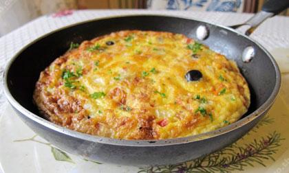 วิธีทำ 1) ตีไข่กับวิปปิ้งครีมเข้าด้วยกัน 2) ละลายเนย 2 ชต.ในกระทะ แล้วเทลงผสมกับไข่ 3) นำเบคอนลงไปนาบในกระทะให้สุกเล็กน้อย จากนั้นใส่เครื่องปรุงที่เหลือลงผัดเพื่อให้มีกลิ่นหอม ยกเว้นมะกอกไม่จำเป็นต้องผัด แล้วปรุงรสด้วยเกลือพริกไทย 4) ใส่เนยที่เหลือลงในกระทะเส้นผ่าศูนย์กลางประมาณ 8 นิ้ว แล้วค่อยๆเทไข่และส่วนผสมอื่นๆลงไป พร้อมกับคนเบาๆ แล้วตั้งไฟพร้อมกับปิดฝาทิ้งไว้ 2-3 นาที หรือจนไข่ฟู 5) นำเข้าเตาอบทั้งกระทะจนหน้าเหลืองกรอบ เวลาเสิร์ฟตัดเป็นชิ้นสามเหลี่ยม และโรยหน้าด้วยพาร์เมซาน ชีส (ถ้าชอบ)