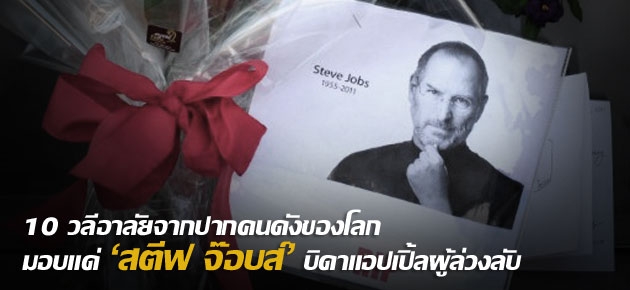 "สตีฟ จ๊อบส์ สร้างตำนานให้คนทำงานมีความสำราญ คิดนอกกรอบอย่างคุณจ๊อบส์ ตอบโจทย์แน่เจริญแท้เอย ขอสดุดี สตีฟ จ๊อบส์"