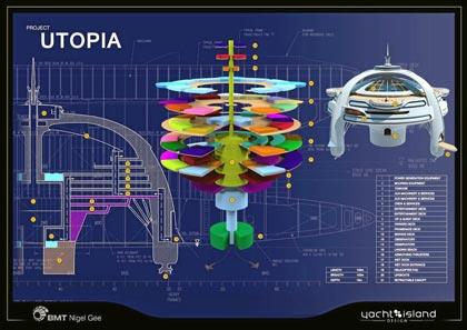 โครงการ ยูโทเปีย (Project Utopia) นี้ เป็นโครงการที่บริษัท บีเอ็มที ไนเจิล จี (BMT Nigel Gee) บริษัทที่ปรึกษาด้านการออกแบบที่ใหญ่ที่สุดรายหนึ่งของโลกจากแดนผู้ดีประกาศ ว่าจะเดินหน้าสร้างโครงการกันอย่างจริงจังในเร็วๆนี้โดยได้เปิดตัวโครงการไป แล้ว ในงานแสดงสินค้าเกี่ยวกับเรือระดับหรูที่โมนาโก (Monaco Yacht Show) เมื่อเดือนกันยายนที่ผ่านมา