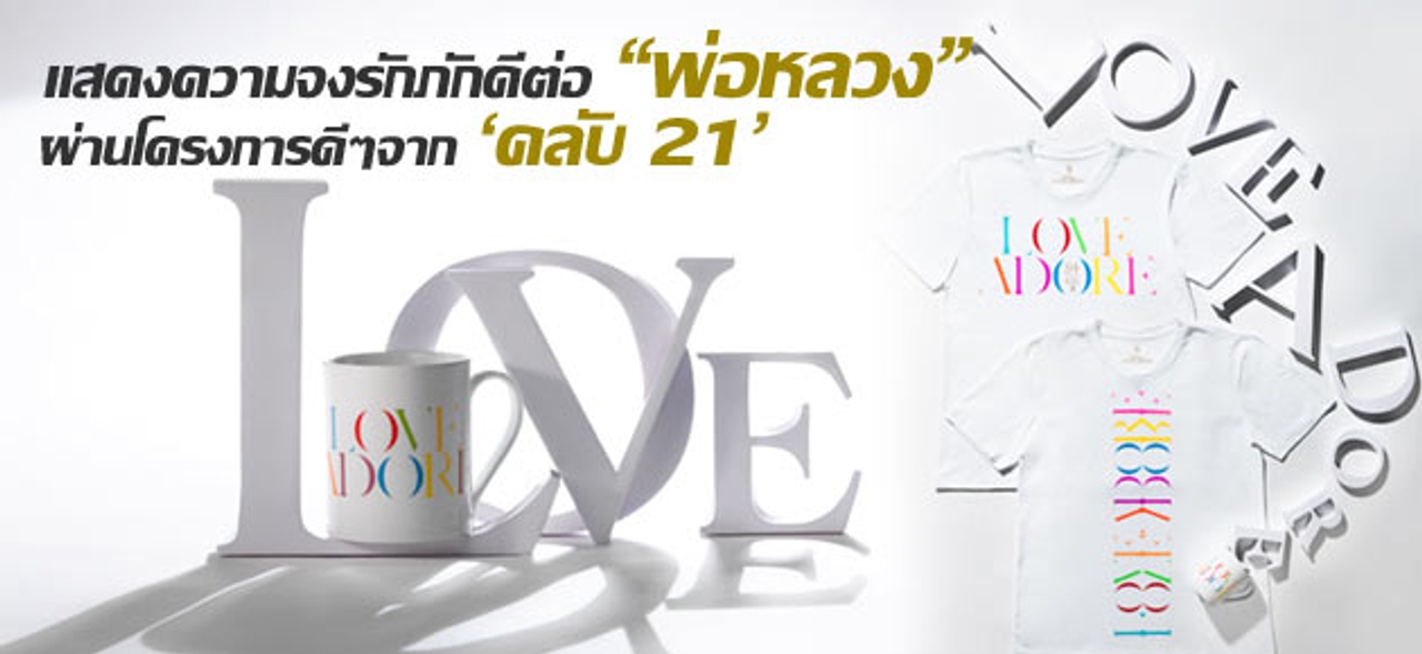 โครงการดังกล่าว เป็นการจัดทำสินค้าในนามบริษัทคลับ 21 ประเทศไทย (จำกัด) ซึ่งมีการออกแบบเป็นพิเศษสำหรับวาระสำคัญนี้โดยเฉพาะ ได้แก่ เสื้อยืดซึ่งมีให้เลือก 2 แบบด้วยกัน และถ้วยกาแฟ โดยสินค้าทั้งหมดพิมพ์ลาย คำว่า “Love Adore” เพื่อเป็นดั่งสารที่ส่งออกไปยังชาวไทยว่า "ทุกคนไม่ว่าใครก็ตามสามารถร่วมแสดงความรัก และความจงรักภักดีต่อพระองค์ท่านด้วยการเป็นส่วนหนึ่งในการสานต่อพระราชปณิธาน ที่จะช่วยให้คนไทยเข้มแข็งและยืนหยัดด้วยตัวเอง"
