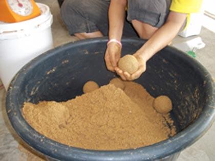 'ดนัย จันทร์เจ้าฉาย' เจ้าของธุรกิจสีขาวและยังเป็นแกนนำสำคัญของมหกรรมดีๆดังกล่าว ได้เล่าว่า "เจ้าลูกบอล EM Ball นี้ย่อมาจาก Effective Micro organisms ซึ่งเกิดขึ้นจากการนำทรายละเอียด 1 ส่วน รำละเอียด 2 ส่วน แกลบ 1 ส่วนครึ่ง ผสมรวมกับน้ำยา EM 50 ซีซีต่อน้ำ 10 ลิตร จากนั้นทั้งหมดมาปั้นเป็นลูกบอล ผึ่งในที่ร่มเป็นเวลา 3 วัน เพื่อให้จุลินทรีย์เติบโต ซึ่งขอยืนยันว่าจุลินทรีย์ที่ว่านี้เป็นจุลินทรีย์ประเภทเดียวกับที่อยู่ในโยเกิร์ต จึงไม่เป็นพิษเป็นภัยต่อคน สัตว์ และพืชอย่างแน่นอน เราจึงเรียกเจ้าจุลินทรีย์เหล่านี้แบบเท่ๆว่า 'จุลินทรีย์คุณธรรม' (หัวเราะ) ขั้นตอนสุดท้ายก็ง่ายมาก แค่นำไปหย่อนในน้ำขังที่ส่งกลิ่นเหม็น รับรองว่าภายในเวลาเพียง 1 สัปดาห์ คุณภาพของน้ำจะดีขึ้น"