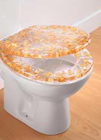 Gold Leaf Toilet Seat ประดับด้วยทองคำที่แผ่นฝานั่ง เห็นทองคำที่กระจายตัวจนเกิดลวดลายที่สวยงาม
