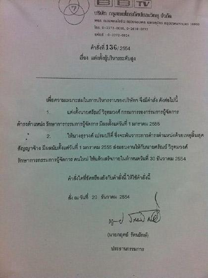 ความคืบหน้าล่าสุด ข่าวเรื่องการเปลี่ยนผู้บริหารช่อง เริ่มชัดเจนขึ้น เพราะมีหนังสือคำสั่งการแต่งตั้งผู้บริหารระดับสูงออกมาแล้ว โดยให้นางสุรางค์ เปรมปรีดิ์ พ้นวาระการดำรงตำแหน่งด้วยเหตุสิ้นสุดสัญญาจ้าง และให้นายศรันย์ วิรุตมวงศ์ ดำรงตำแหน่งรักษาการกรรมการผู้จัดการคนใหม่ให้แล้วเสร็จภายในวันที่ 30 ธันวาคม 2554