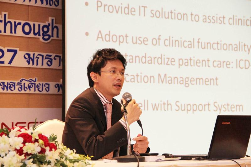 นอกจากนี้ มีข้อมูลสนับสนุนจากสถาบันรับรองมาตรฐานคุณภาพโรงพยาบาล JCI ในการประชุม JCI Executive Briefing ที่ประเทศอิตาลี เมื่อปลายปีที่ผ่านมา โดยหัวข้อที่ JCI เน้นเรื่องเกี่ยวกับการนำ Information มาใช้ในกระบวนการการดูแลผู้ป่วย เพราะฉะนั้น ระบบ Health IT ที่ใช้อยู่ใน รพ.ของเรา หากไม่สามารถรองรับการจัดการข้อมูลได้พร้อมและเพียงพอ เราก็เดินไปข้างหน้าได้ลำบาก การนำเทคโนโลยีมาช่วยวิเคราะห์ข้อมูลทางการแพทย์ รวมถึงช่วยสนับสนุนการตัดสินใจจะเข้ามามีบทบาทอย่างมาก