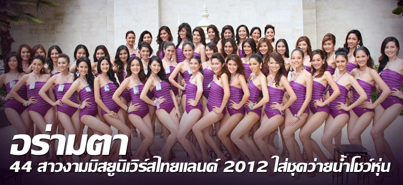 44 สาวงามผู้เข้าประกวด มิสยูนิเวิร์สไทยแลนด์ 2012 ประชันโฉมกันสุดร้อนในชุดว่ายน้ำ อวดสัดส่วนโค้งเว้า ริมสระน้ำโรงแรมสยามเคมปินสกี้ ท้าทายทุกสายตาสู้ความร้อนระอุของอากาศเมืองกรุง ก่อนวิ่งไปขึ้นเครื่องบินเก็บตัวที่ จ.พิษณุโลก...
