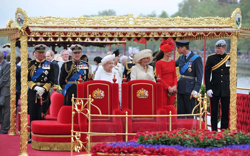 เมื่อได้ฤกษ์ดีในช่วงบ่าย สมเด็จพระบรมราชินีเอลิซาเบธที่สอง ปรากฏพระองค์ในฉลอง พระองค์ชุดสีขาวงามสง่า ประดับประดาด้วยคริสตัลสวารอฟสกี้ พร้อมพระมาลาทรงเก๋ไก๋สีขาวเข้า เซต ผลงาน การออกแบบของ “แองเจล่า เคลลี่” ทรงโบก พระหัตถ์ทักทายฝูงชนหลายหมื่นคนที่มาเฝ้ารอรับ เสด็จฯ ก่อนเสด็จฯขึ้นประทับบนเรือพระที่นั่ง “เดอะ สปิริต ออฟ ชาร์ตเวลล์” ซึ่งได้รับตกแต่งงดงามวิจิตรเพื่อใช้สำหรับพระราชพิธีครั้งนี้ โดยมีเหล่าพระบรม วงศานุวงศ์ของวินด์เซอร์เสด็จร่วมพระราชพิธีอย่างอบอุ่นพร้อมหน้า นำโดย “เจ้าชายฟิลิป” ดยุคแห่ง เอดินเบอระ, เจ้าฟ้าชายชาร์ลส์ กับพระชายา “ดัชเชสแห่งคอร์นวอลล์”, เจ้าชายวิลเลี่ยม กับพระชายา “ดัชเชสแห่งเคมบริดจ์” และเจ้าชายแฮรี่