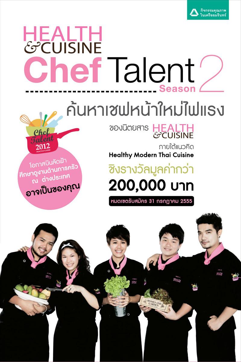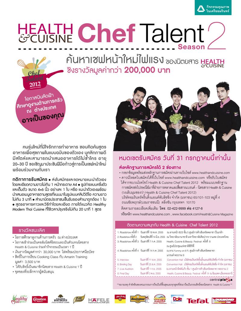 นิตยสาร Health & Cuisine นิตยสารอาหารเพื่อสุขภาพที่สร้างแรงบันดาลใจในการใช้ชีวิต หนึ่งในผลงานคุณภาพในเครือบริษัทอมรินทร์ฯ จัดกิจกรรม Health & Cuisine Chef Talent 2012 เพื่อเปิดโอกาสให้คนรุ่นใหม่ที่มีใจรักการทำอาหาร ชอบคิดค้นสูตรอาหารเพื่อสุขภาพในแบบฉบับของตัวเอง บุคลิกภาพดี มีสไตล์และสามารถนำเสนออาหารได้ไม่ซ้ำใคร อายุ 20-30 ปี ขอเชิญมาประชันฝีมือก้าวสู่การเป็นเชฟหน้าใหม่พร้อมร่วมงานกับพวกเขา