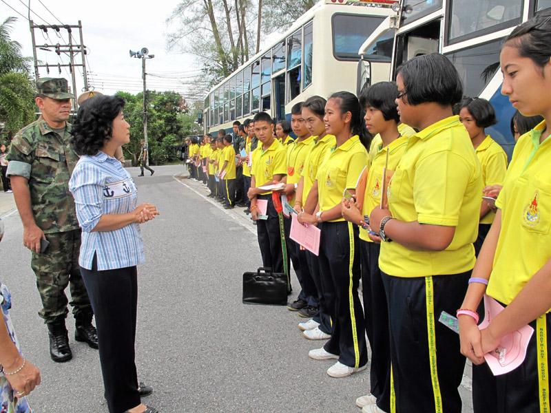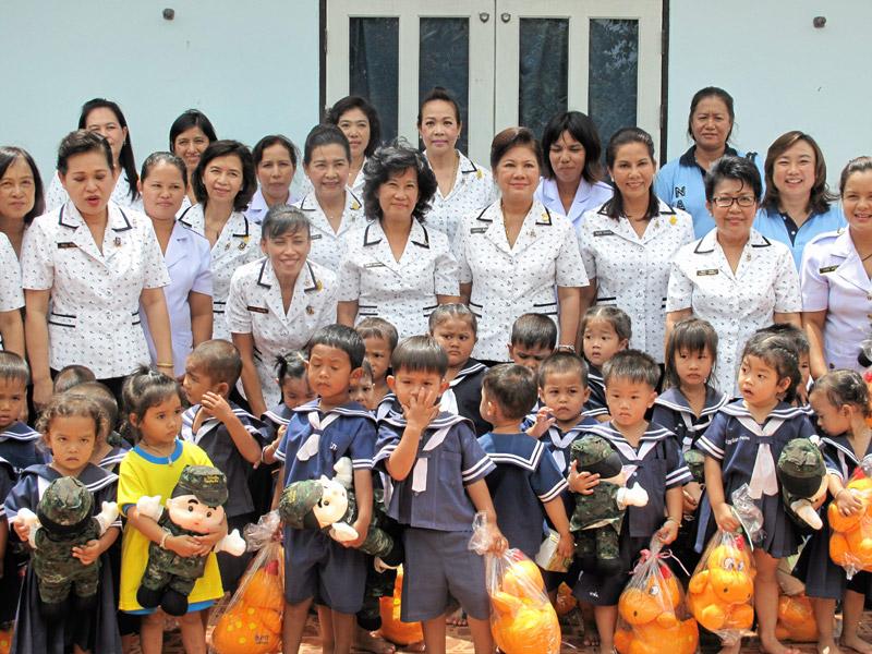 ก่อนกลับชาวคณะยังได้ตื่นเช้าเพื่อไปร่วมส่งเด็กๆลูกหลานในค่ายเดินทางไปขึ้นรถบัสไปโรงเรียนซึ่งอยู่นอกค่าย โดยทางทหารเรือได้จัดรถบัสจำนวน 4-5 คัน ไปคอยรับและส่งเด็กๆ ทั้งโตและเล็ก ซึ่งทุกคันจะมีนายทหารเรือนาวิก– โยธิน 2 นาย พร้อมอาวุธคอยให้ความคุ้มครองอยู่บริเวณประตูหน้าและหลังอีกด้วย ซึ่ง พรจิตร์ นายกสมาคมภริยา ทร. กล่าวว่า การเดินทางมาครั้งนี้เพื่อให้เกิดความใกล้ชิด ซึ่งทางสมาคมฯเราพยายามที่จะดูแลเยี่ยมเยียนหน่วย ทร.ทุกภาคและอยากลงไปทุกหน่วย นี่เป็นครั้งแรกในรอบหลายปีที่ทางสมาคมฯได้เดินทางมาใน 3 จ.ชายแดนภาคใต้ ทั้งนี้เพราะอาจจะไม่สะดวกในเรื่องกำลังพล ในค่ายนี้มีครอบครัวทหารเรืออยู่กัน 350 ครอบครัว มีนายทหารกว่า 3,500 นาย เราจึงอยากมาเยี่ยมและให้กำลังใจ แสดงความรักและความห่วงใย พร้อมทั้งดูแลในเรื่องความเป็นอยู่ ซึ่งหน่วยงานทั้งหมดเป็นหน่วยสำคัญยิ่งในการปกป้องเอกราชของชาติ ซึ่งสมาชิกในค่ายต่างมีขวัญและกำลังใจดีมาก