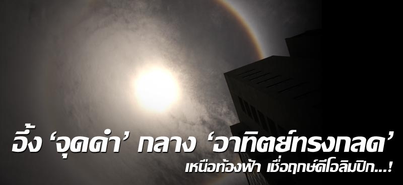ฮือฮาสร้างความแตกตื่นกันใหญ่หลังจากทีมข่าวไทยรัฐออนไลน์ได้รับแจ้งเมื่อช่วงเที่ยงวันที่ 31 ก.ค. ว่ามีประชาชนพบเห็นเหตุการณ์ประหลาดขึ้นเหนือท้องฟ้า นอกจากจะเป็นลักษณะของดวงอาทิตย์ทรงกลดเกิดขึ้นแล้ว ก่อนหน้านี้ไม่กี่นาทีประชาชนยังอ้างว่ามีจุดสีดำประหลาดปรากฏอยู่ในใจกลางของพระอาทิตย์ทรงกลดตระหง่านด้วยสร้างความตกตะลึงเป็นอย่างมาก