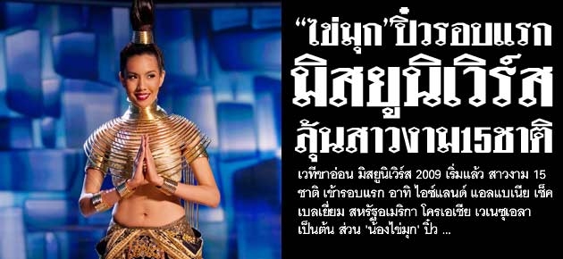 เวทีขาอ่อน มิสยูนิเวิร์ส 2009 เริ่มแล้ว สาวงาม 15 ชาติเข้ารอบแรก อาทิ ไอซ์แลนด์ แอลแบเนีย เช็ค เบลเยี่ยม สหรัฐอเมริกา โครเอเชีย เวเนซุเอลา เป็นต้น ส่วน 'น้องไข่มุก' ปิ๋ว ...
