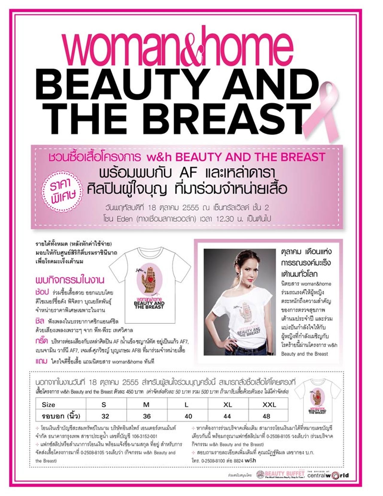 พิเศษ ! วันพฤหัสบดีที่ 18 ตุลาคม 2555 นิตยสาร woman&home จัดกิจกรรมจำหน่ายเสื้อในราคาพิเศษ พร้อมพบกับ มะนาว ศรศิลป์ มณีวรรณ์ มิสทีน ไทยแลนด์ 2008, น้ำแข็ง-ชญาน์ทัต อยู่เป็นแก้ว AF7, เบนจามิน วาร์นี AF7, เจมส์-ศุภวิชญ์ บุญเกษม AF8 และเหล่าดารา ศิลปินใจบุญที่มาร่วมจำหน่ายเสื้อ ในบรรยากาศชิคแอนด์ชิลล์ด้วยเสียงเพลงจากศิลปินรับเชิญ พีท-พีระ เทศวิศาล ร่วมบุญ ร่วมเชียร์อัพให้กำลังใจผู้หญิง พบกันที่เซ็นทรัลเวิลด์ ชั้น 2 โซน Eden (ทางเชื่อมสกายวอล์ก) ผู้สนใจสามารถสั่งซื้อเสื้อโครงการได้โดยตรงที่ woman&home จำหน่ายตัวละ 450 บาท โทร.02-508-8100 ต่อ 8824