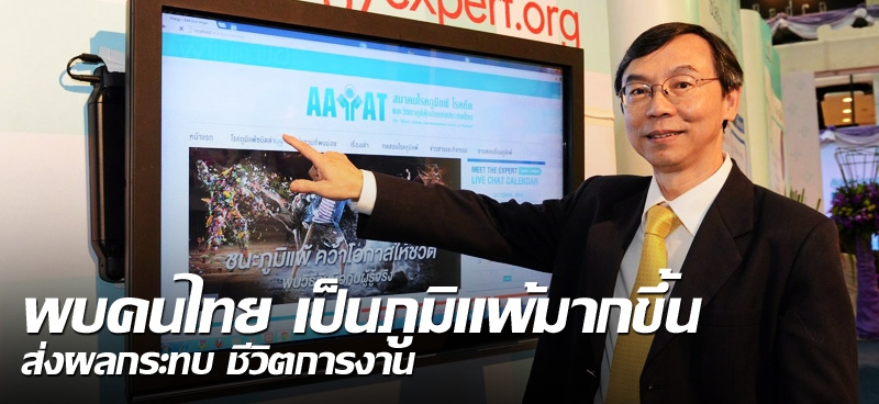 ภายในงาน ศ.นพ.เกียรติ รักษ์รุ่งธรรม นายกสมาคมโรคภูมิแพ้ฯ กล่าวว่า โรคภูมิแพ้พบในทุกเพศทุกวัย แต่พบในเด็กมากกว่าผู้ใหญ่ โรคภูมิแพ้ที่พบบ่อยในคนไทย ได้แก่ โรคภูมิแพ้ทางจมูก รองลงมาคือ โรคหืด และโรคภูมิแพ้ทางผิวหนัง ทั้งนี้  สาเหตุเกิดจากพันธุกรรมและสารก่อภูมิแพ้ในสิ่งแวดล้อม รวมถึงปัจจัยจากมลพิษในอากาศ หากเป็นโรคภูมิแพ้เรื้อรังและเป็นมาก จะทำให้เหนื่อยง่าย หายใจไม่อิ่ม อ่อนเพลียนอนไม่มีประสิทธิภาพ ส่วนอาการโรคภูมิแพ้ที่พบบ่อยๆ ได้แก่ เป็นหวัดเรื้อรัง จาม คันจมูก ไอบ่อยเวลาอากาศเปลี่ยน มีผื่นคันตามข้อพับ แขนขาเป็นๆหายๆ หรือมีอาการปากบวม หรือเกิดลมพิษขึ้นทันทีหลังรับประทานอาหาร ฯลฯ