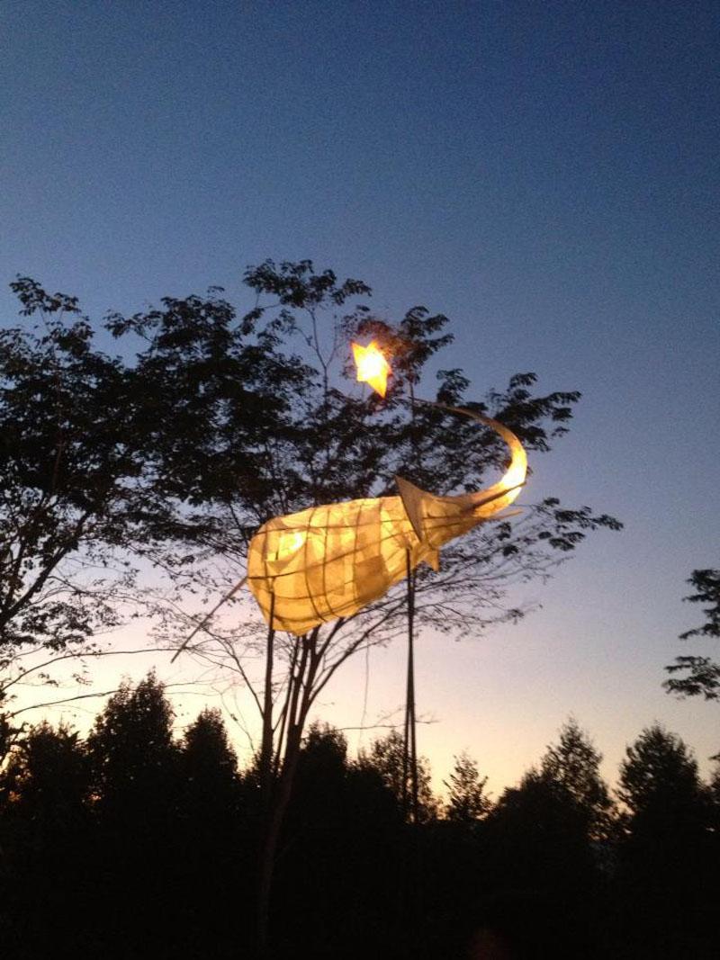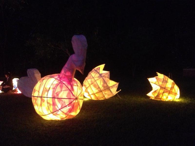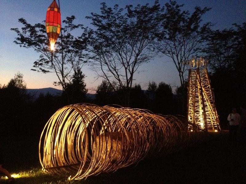 ผลงานประติมากรรมไม้ไผ่ของเหล่าศิลปินเชียงราย ซึ่งนำมาจัดแสดงภายในงานแถลงข่าวเปิดตัวขัวศิลปะ