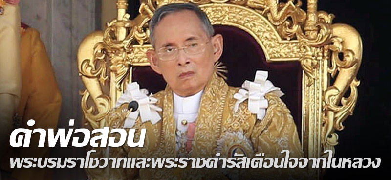 นอกจากการประกอบพระราชกรณียกิจนานัปการเพื่อทำหน้าที่ “พ่อแห่งแผ่นดิน” ภายใต้พระปฐมบรมราชโองการ “เราจะครองแผ่นดินโดยธรรม เพื่อประโยชน์สุขแห่งมหาชนชาวสยาม” ที่ทรงให้คำมั่นไว้ในพระราชพิธีบรมราชาภิเษก ณ พระที่นั่งไพศาลทักษิณ เมื่อวันที่ 5 พ.ค. 2493 พระบรมราโชวาทและพระราชดำรัสต่างๆที่พระบาทสมเด็จพระเจ้าอยู่หัว พระราชทานแก่พสกนิกรชาวไทยในหลายวาระหลายโอกาส โดยเฉพาะในยามที่บ้านเมืองต้องเผชิญกับวิกฤติรุนแรง ก็ล้วนแต่เป็น “คำพ่อสอน” ที่ลูกๆคนไทยทั้งแผ่นดิน ควรน้อมนำมาปฏิบัติอย่างยิ่ง นอกจากจะเป็นเครื่องเตือนใจให้ฉุกคิด และครองสติอยู่ในศีลธรรมอันดีงาม ยังเป็นดังแสงเทียนส่องนำทางสู่ความสว่างไสว พร้อมนำพาประเทศชาติให้กลับคืนสู่ความสงบสุขครั้งแล้วครั้งเล่า