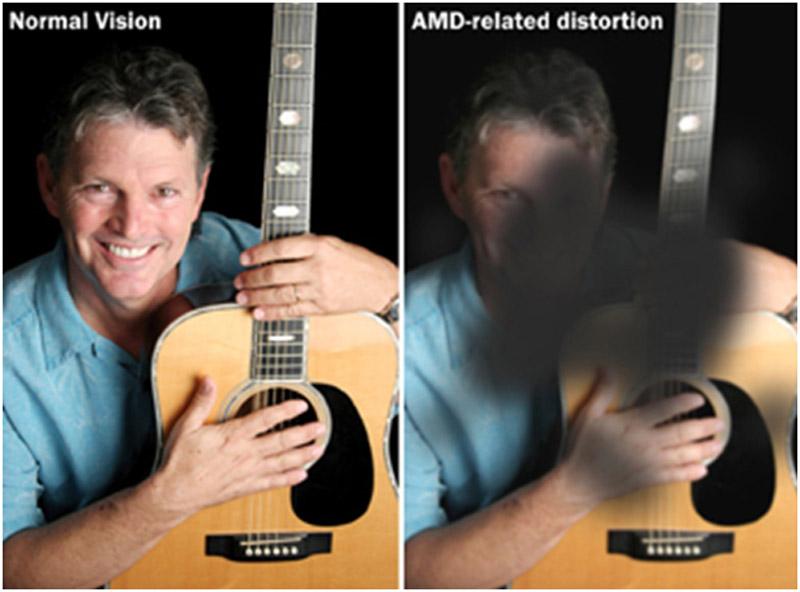 อาการของเอเอ็มดี ทำให้การมองเห็นภาพบิดเบื้ยวโค้งผิดรูป โดยเฉพาะเวลาดูเส้นตรง หรืออ่านหนังสือ การมองเห็นโดยรวมลดลง ภาพไม่มีความชัดเจน อาจมองเห็นเหมือนมีเงาดำ หรือจุดบอด เกิดขึ้นที่บริเวณพื้นที่ตรงส่วนกลางของการมองเห็น