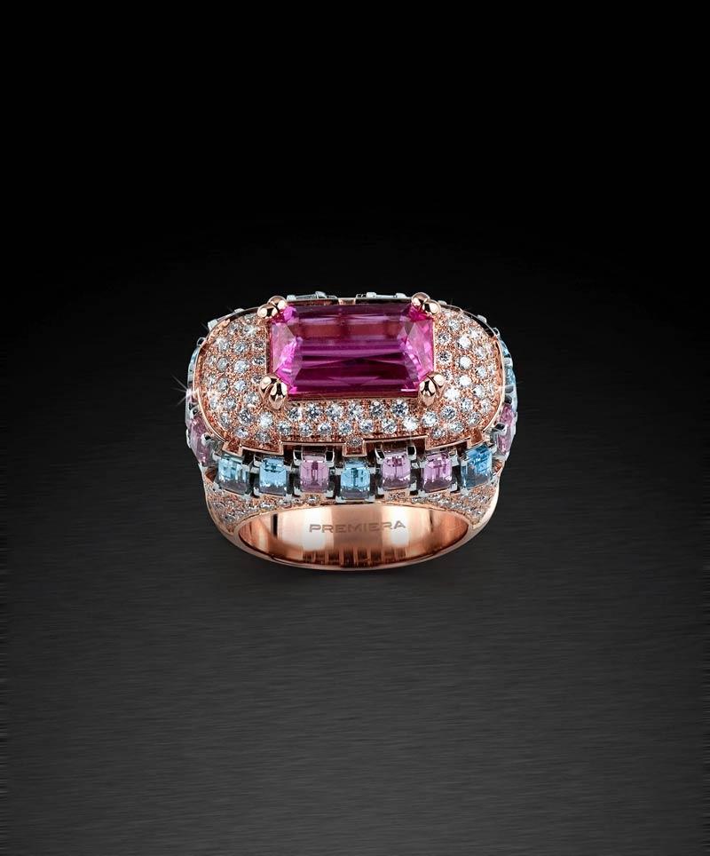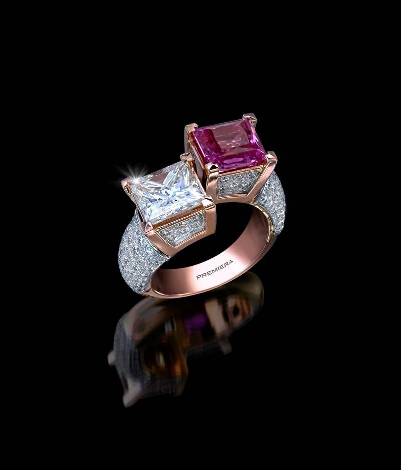 จิ๊บ : จุดเด่นของแบรนด์ PREMIERA อยู่ที่การรู้จักใช้เพชรและอัญมณีสีสันต่างๆเข้าคู่กันอย่างสวยงาม โดยสามารถดึงเอาความโดดเด่นของเพชรและอัญมณีแต่ละชนิดออกมาได้น่าทึ่ง ขณะที่เซตติ้งของเราก็ดูพลิ้วไหวราวกับมีชีวิต การสร้างแบรนด์ใหม่เกิดขึ้นได้เพราะคุยกับผู้ผลิตเครื่องประดับจิวเวลรี่ชื่อดังของอิตาลี “มร.คอร์ราโด” ซึ่งเป็นลูกค้าเก่าแก่ของเรา จึงตัดสินใจร่วมมือกันสร้างสรรค์ชิ้นงานจิวเวลรี่ขึ้นมา โดยใช้เทคนิคชั้นสูงและกระบวนการผลิตทันสมัยของอิตาลี ผสมผสานกับวัตถุดิบชั้นยอดของเรา มีการคัดช่างฝีมือระดับท็อปของพรีเมียร่า 4 คน จาก 100 คน เพื่อมาเทรนเทคนิคกับช่างอิตาเลียนใกล้ชิด กว่าจะได้ผลงานชิ้นแรกต้องใช้เวลาปีครึ่ง เพราะเขาจะคุมเข้มทุกขั้นตอนเองหมด