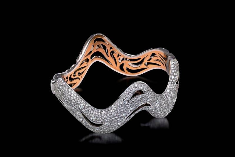 จอย : แต่ละชิ้นต้องใช้เวลาทำเป็นปี เพราะทำทีละชิ้นๆแล้วค่อยนำมาประกอบรวมกัน เพื่อให้พลิ้วไหวและแนบไปกับสรีระผู้สวมใส่ที่สุด เราได้เรียนรู้อะไรเยอะจากช่างอิตาเลียน ไม่ว่าจะเป็น เทคนิคการฉลุลายที่ละเอียดอ่อน, เทคนิคฝังเพชรแบบ 3 มิติ และเทคนิคทำเซตติ้งแบบอิตาลีที่ประกอบขึ้นจากชิ้นเล็กหลายๆชิ้น แทนที่จะหล่อขึ้นมาชิ้นเดียว