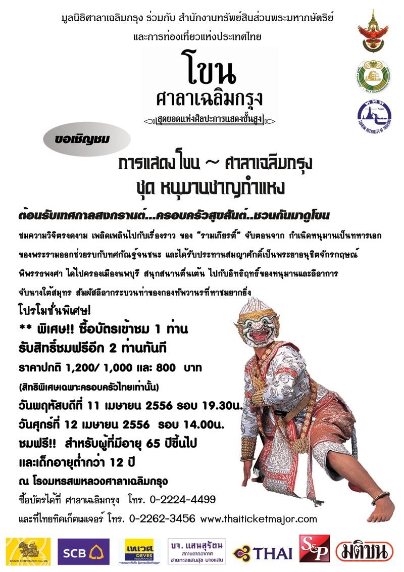 ต้อนรับเทศกาลสงกรานต์ ครอบครัวสุขสันต์...ชวนกันมาดูโขน ขอเชิญชมโขน ชุดหนุมานชาญกำแหง โปรโมชั่นพิเศษ ซื้อบัตรเข้าชม 1 ท่าน รับสิทธิ์เข้าชมฟรีอีก 2 ท่าน (สิทธิพิเศษเฉพาะครอบครัวคนไทยเท่านั้น) รอบการแสดง วันพฤหัสบดีที่ 11 เมษายน 2556 รอบ 19.30 น. วันศุกร์ที่ 12 เมษายน 2556 รอบ 14.00 น.