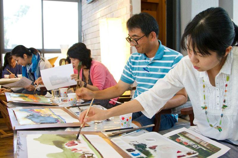 หลังจบการสาธิตแล้ว ถึงเวลาลูกศิษย์ทั้งหลายได้โชว์ฝืมือกันบ้าง อ.บันชา จึงให้ทุกท่านวาดภาพสีน้ำสไตล์ไทยๆ อาทิ บ้านศาลาริมน้ำ บ้านพักริมทะเล ตลาดน้ำ เป็นต้น แต่ละท่านก็แสดงฝีมือกันอย่างเต็มที่ บางท่านก็มีพื้นฐานและเทคนิคเฉพาะตัวที่น่าสนใจ บางท่านก็ไม่มีพื้นฐานมาเลย โดยอาจารย์คอยให้คำแนะนำแบบตัวต่อตัวอย่างเป็นกันเอง เพื่อให้ผลงานมีความสมบูรณ์มากขึ้น ไม่น่าเชื่อว่าบางท่านจะวาดเป็นครั้งแรก เพราะภาพออกมาสวยงามมากเลยทีเดียว หลังเสร็จสิ้นการสร้างสรรค์ชิ้นงาน ก่อนจะเก็บภาพวาดฝีมือตัวเองเป็นที่ระลึก ทุกท่านจึงต้องขอแชะ! ถ่ายภาพคู่กับอาจารย์บันชาไว้เป็นที่ระลึกซะหน่อย ก่อนรับประทานอาหารกลางวันร่วมกัน ที่ห้องอาหารแทพเพสทรี โรงแรมคามิโอ เฮ้าส์ ศรีราชา เป็นติ่มซำแสนอร่อย ก่อนแยกย้ายกันกลับไปพักผ่อนด้วยความประทับใจ