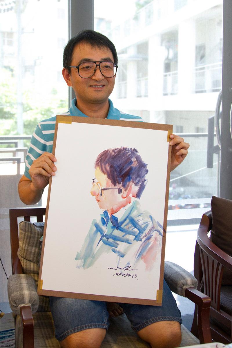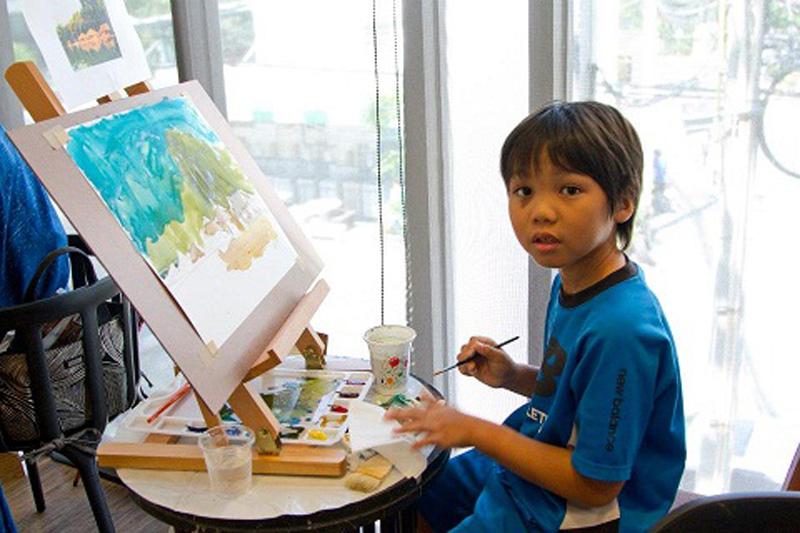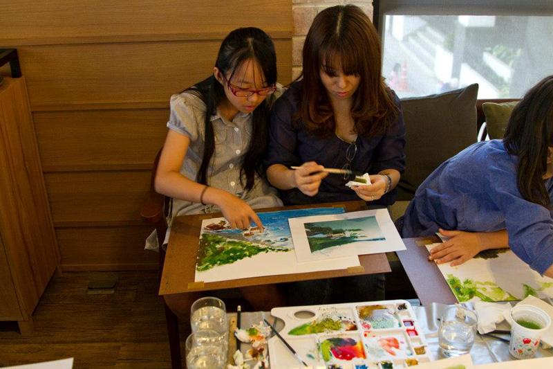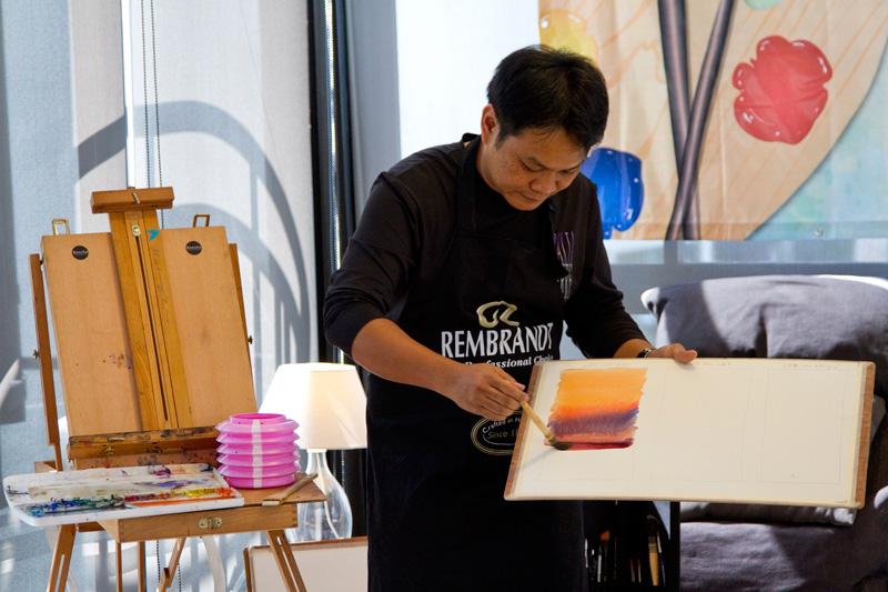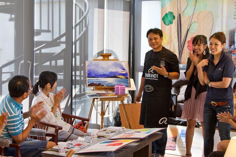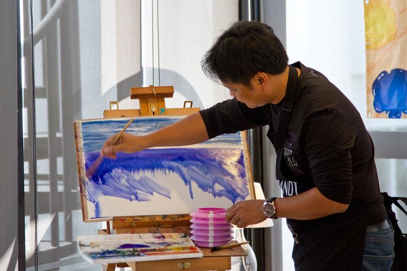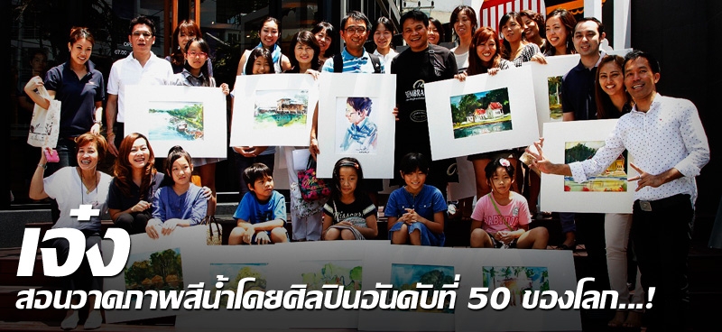 ภายในงานมีผู้ร่วมกิจกรรมกว่า 25 ท่าน มีทั้งคุณแม่จูงมือหนูน้อยญี่ปุ่น บางกลุ่มก็มากันทั้งครอบครัว ท่ามกลางในบรรยากาศแสนอบอุ่น ภายในร้านกาแฟเก๋ๆ ก่อนจะลงมือโชว์ลวดลาย อ.บันชา ศรีวงศ์ราช ได้แจกอุปกรณ์สำหรับทุกท่าน พร้อมสาธิต และสอนเทคนิคต่างๆ ของการใช้อุปกรณ์ และที่สำคัญคือ เทคนิคในการวาดภาพสีน้ำแบบง่ายๆ ซึ่งชาวญี่ปุ่นทุกท่านต่างให้ความสนใจ และตื่นตาตื่นใจเป็นอย่างมาก เนื่องจากก่อนที่ทุกท่านจะได้โชว์ฝีมือ อาจารย์ได้นำเทคนิคที่สอนไปทั้งหมดนำมาโชว์ลวดลาย 1 ภาพ โดยใช้เวลาวาดภาพไม่ถึง 3 นาที! และแอบมีทริกเล็กน้อย โดยการกลับหัวกลับหางภาพ จากนั้นทุกท่านก็ร้อง ‘ว้าว!’ พร้อมปรบมือชอบใจกันยกใหญ่ เพราะภาพนั้นคือ ‘ภาพเกาะสีชัง’