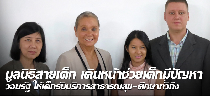 ม.ร.ว.สุพินดา จักรพันธุ์ (ที่ 2 จากซ้าย) ประธานมูลนิธิสายเด็ก 1387 พร้อมทีมผู้บริหาร ผลบุญ นันทมานพ, ทิพยนิภา ไกรฤกษ์ และอิเลีย สมินอฟ ผอ.มูลนิธิฯ.