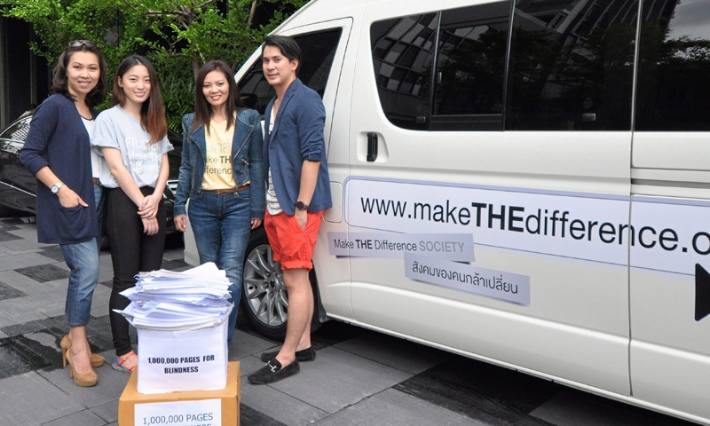 รุ่งเพ็ชร พรรณาปยุกต์ (ที่ 2 จากขวา)จากทีเอ็มบี ร่วมสนับสนุนการบริจาคกระดาษ ให้โรงเรียนสอนคนตาบอด จากไอเดียของศุภราดา ธวัชราภรณ์ (ที่ 2 จากซ้าย).