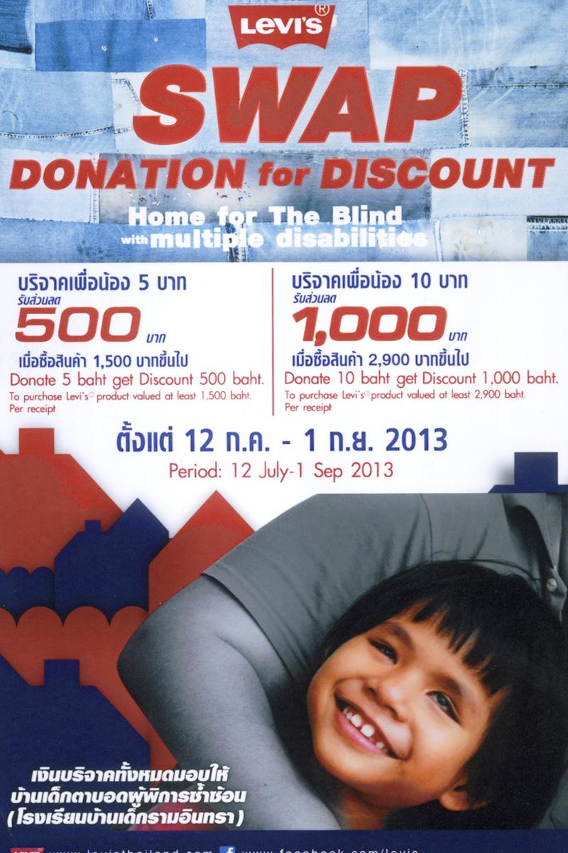 ลีวายส์ จัดแคมเปญ “บริจาคเงิน แลกรับส่วนลดยีนส์” โดยบริจาคเงิน 5 บาท ที่ร้านลีวายส์ ทุกสาขาทั่วประเทศ รับส่วนลดจากลีวายส์ ทันที 500 บาท เมื่อซื้อสินค้าครบ 1,500 บาท หรือบริจาคเงิน 10 บาท รับส่วนลด 1,000 บาท เมื่อซื้อครบ 2,900 บาท วันนี้จนถึงวันที่ 1 ก.ย. รายได้นำไปส่งมอบให้บ้านเด็กตาบอดผู้พิการซ้ำซ้อน ที่ ร.ร.บ้านเด็กรามอินทรา สังกัดมูลนิธิธรรมิกชนเพื่อคนตาบอดในประเทศไทย... โรงแรมเซ็นทาราแกรนด์ เซ็นทรัลเวิลด์ ร่วมกับดารา-นักร้องคนดัง ออกแบบลายเสื้อยืดบอกรักแม่ เนื่องในวันแม่แห่งชาติ ในราคาตัวละ 300 บาท ที่ร้านซิงค์เบเกอรี่ ชั้น G ของโรงแรม วันนี้ถึงเดือน ส.ค.หรือจนกว่าของหมด รายได้หลังหักค่าใช้จ่ายนำไปสมทบทุนศูนย์สิริกิติ์บรมราชินีนาถ (เพื่อมะเร็งเต้านม)...