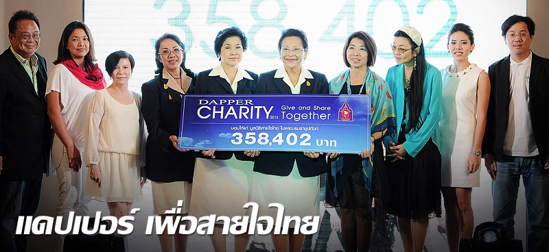 เป็นอีกหนึ่งแบรนด์แฟชั่นที่ต้องตอบแทนคืนสังคมอย่างต่อเนื่อง ปีนี้เป็นปีที่ 3 สำหรับ “DAPPER Charity 2013” ซึ่งจัดขึ้นภายใต้คอนเซปต์ “Give and Share Together” ที่มาปลุกพลังหนุ่มสาวให้ร่วมกิจกรรมเพื่อหารายได้สมทบทุนมูลนิธิสายใจไทย ที่เซ็นทรัล พลาซา ลาดพร้าว เมื่อเร็วๆนี้