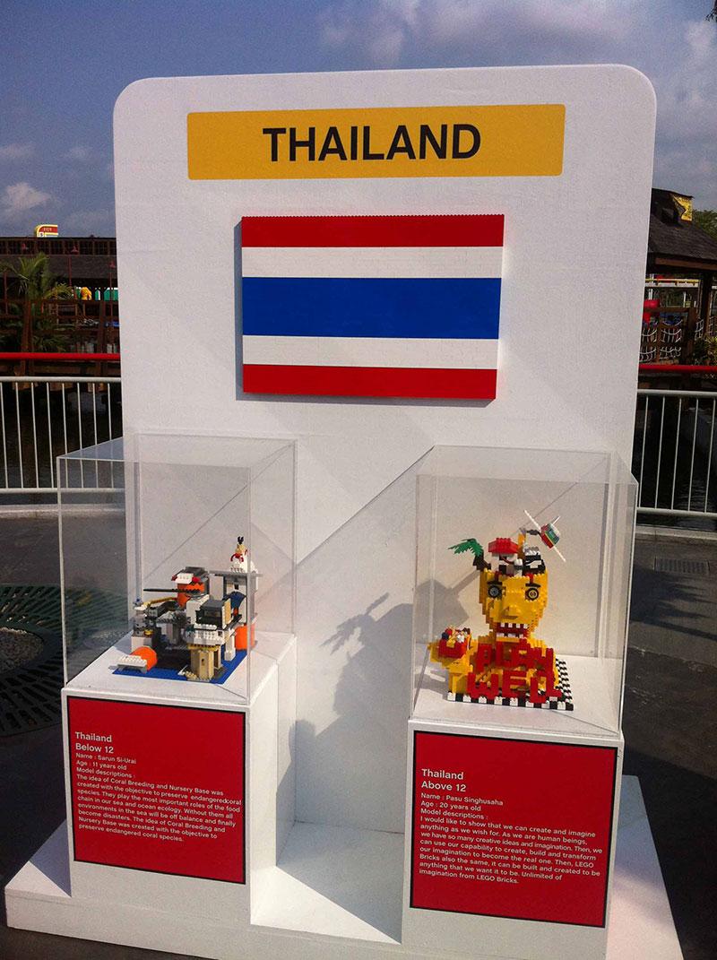 สำหรับ 2 ตัวแทนเยาวชนไทย ที่ได้เข้าร่วมกิจกรรมยิ่งใหญ่ในครั้งนี้คือ ตัวแทนแชมป์ประเทศไทย ในรุ่นอายุต่ำกว่า 12 ปี คือ ด.ช.สรัล สีอุไรย์ อายุ 12 ปี นำผลงาน “ฐานปฏิบัติการเพาะพันธุ์ปะการัง” ไปโชว์ ณ เลโก้แลนด์ มาเลเซีย โดยน้องสรัลได้เล่าถึงแรงบันดาลใจที่สร้างสรรค์ผลงานนี้ ขึ้นมาว่า “ผมชอบและมีความสุขในการเล่นตัวต่อเลโก้ โดยส่วนตัวผมเป็นคนรักธรรมชาติ ผมเลยต่อผลงานชิ้นนี้ขึ้นมา เพื่อสื่อถึงการอนุรักษ์ประเทศไทย เนื่องจากท้องทะเลไทยในปัจจุบันเหลือปะการังน้อยมาก เพื่อความสมบูรณ์ของท้องทะเล จึงสร้างฐานปฏิบัติการเพาะพันธุ์ปะการังขึ้น”